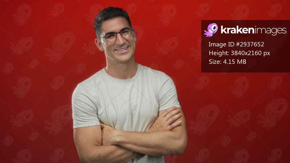 Young hispanic man with arms crossed wearing glasses and a white tee in a red studio; confidence approachability ease.