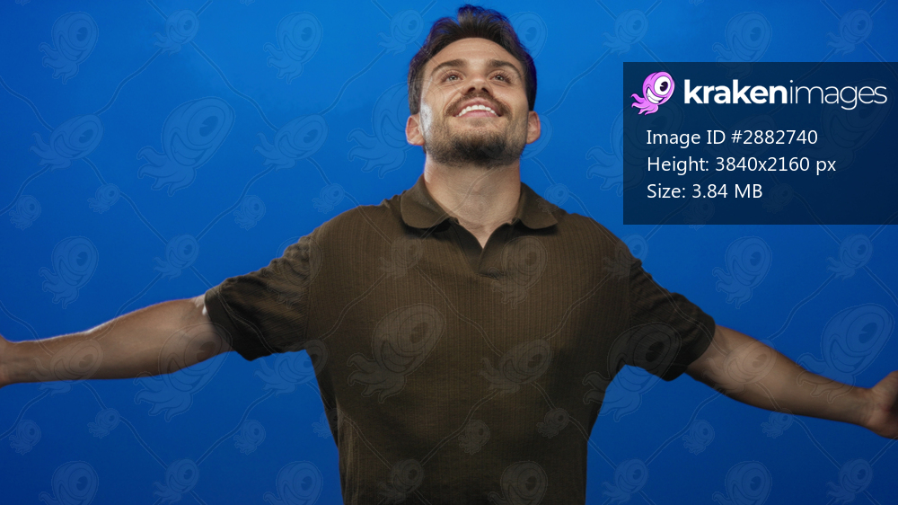 Young hispanic man with arms outstretched and open hands in studio against bright blue backdrop; serenity.