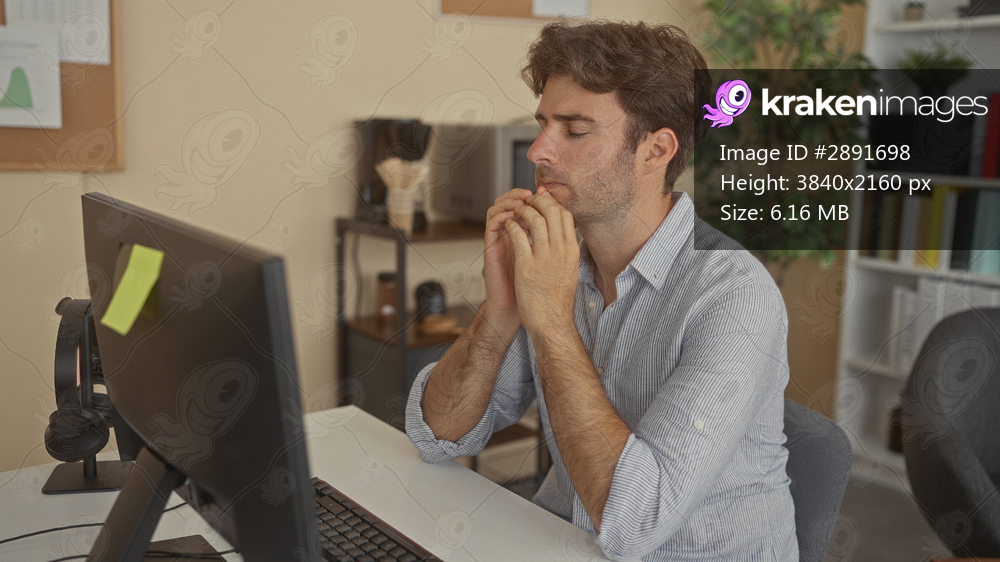 Young hispanic man at computer monitor with hands on temples in office building; stress concentration deadline.
