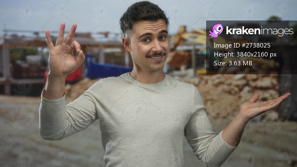 Young hispanic man at construction site outdoors making okay gesture with hand and smiling confidently amidst machinery and building activity in progress. - Kraken Images