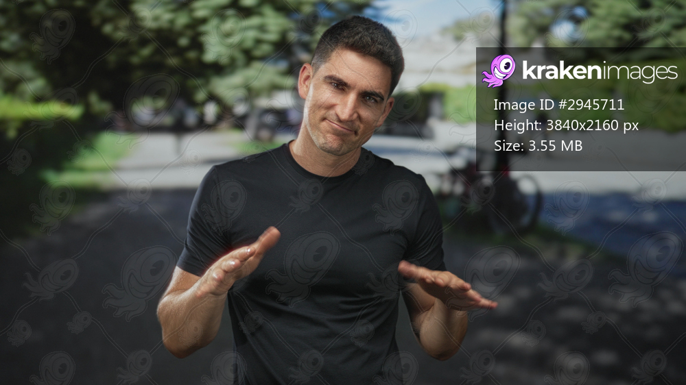 Young hispanic man with bare hands palms down making a calming gesture on a street near parked bicycles; calm guidance.