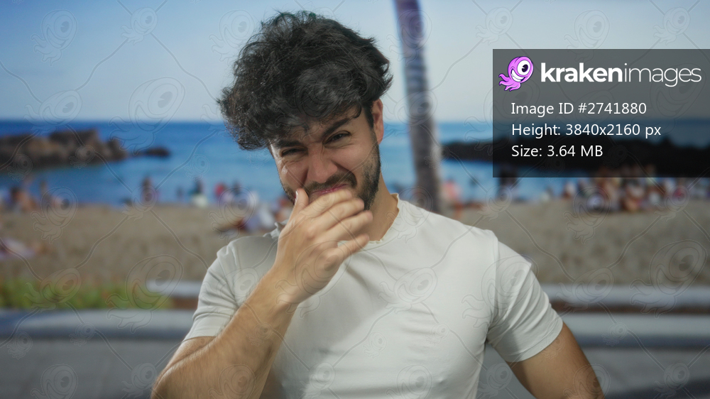 Young hispanic man with beard at beach sneezes while standing on seaside, palm tree and sea visible in background, capturing an outdoor coastal moment. - Kraken Images