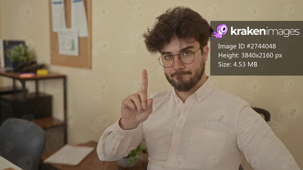 Young hispanic man with beard gesturing no in an office setting, wearing glasses and a button-up shirt while sitting indoors with bulletin board and papers in background. - Kraken Images