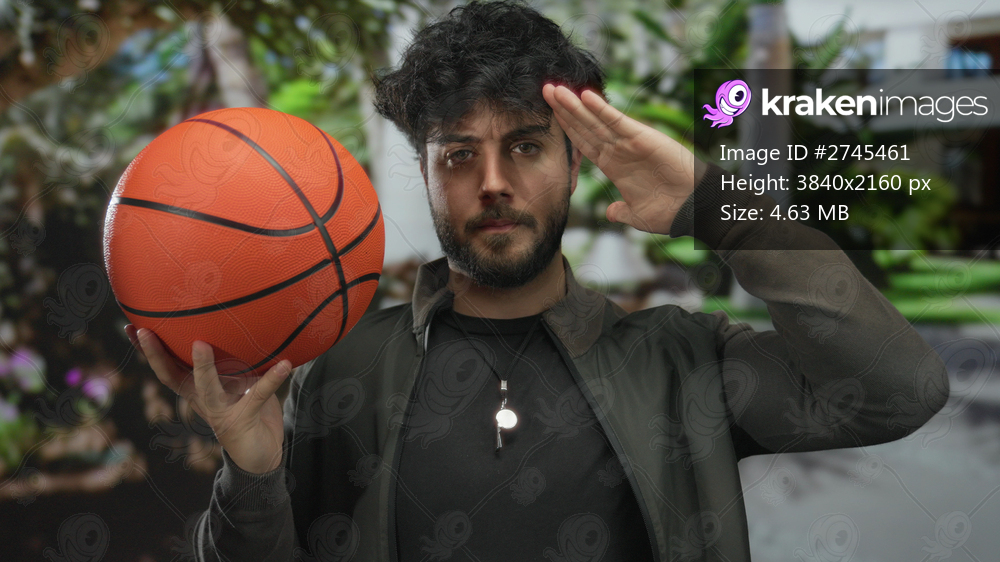 Young hispanic man with beard giving military salute while holding basketball in green outdoor park setting