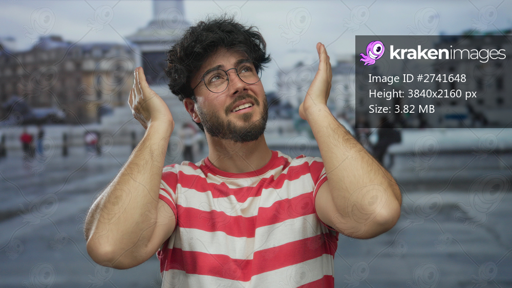 Young hispanic man with beard and glasses covering his ears outdoors on a busy street appearing stressed by noise, wearing a striped shirt in an urban setting with blurred buildings. - Kraken Images