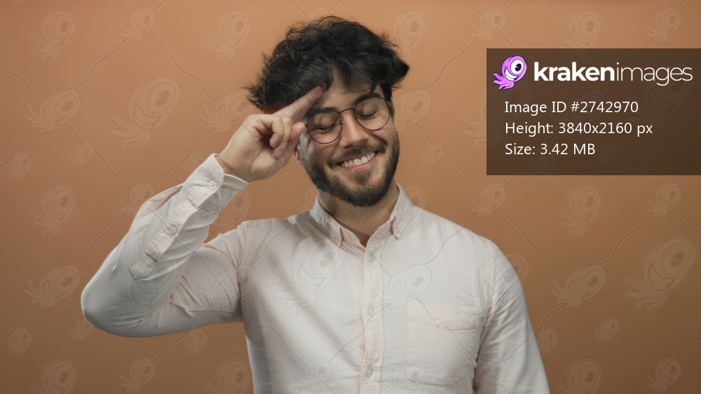 Young hispanic man with beard and glasses in white shirt posing against an orange background, smiling and gesturing with fingers on head, creating a positive and friendly vibe. - Kraken Images