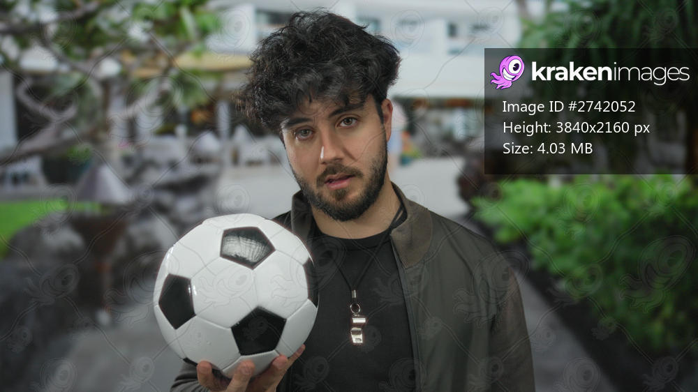 Young hispanic man with beard holding soccer ball outdoors on street, wearing whistle, surrounded by greenery, displaying contemplative expression in casual attire. - Kraken Images