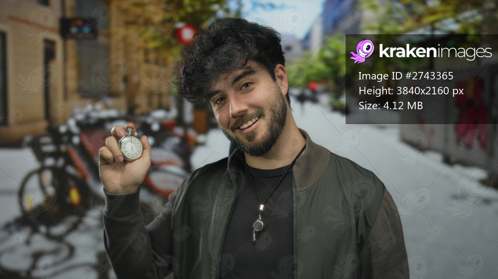 Young hispanic man with beard holding stopwatch and pointing finger in sunny street with blurred bicycles and buildings in background suggesting urgency and action. - Kraken Images