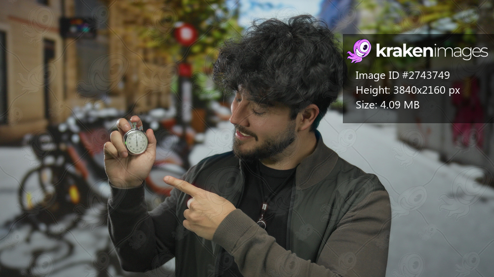 Young hispanic man with beard holding stopwatch and pointing finger in sunny street with blurred bicycles and buildings in background suggesting urgency and action. - Kraken Images