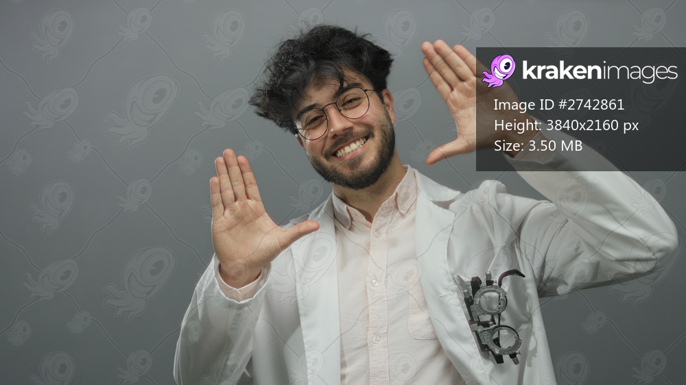 Young hispanic man with beard in glasses smiles and gestures in a white coat against a gray background displaying confidence and friendliness.