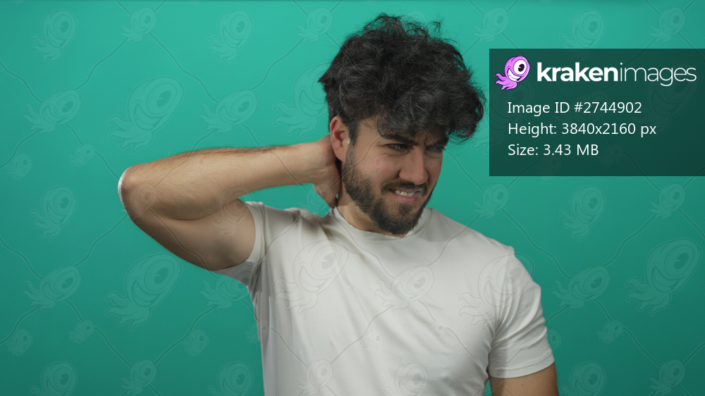 Young hispanic man with beard in white shirt expressing neck discomfort against a green background, indicating possible pain or tension.