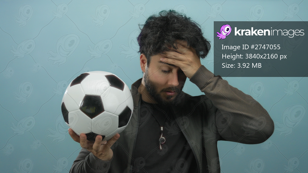 Young hispanic man with beard looks concerned while holding a soccer ball against a plain blue background, suggesting worry or contemplation about a sports-related issue. - Kraken Images