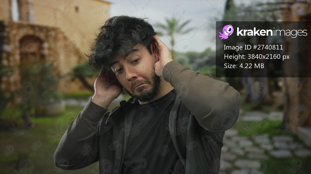 Young hispanic man with beard outdoors on a sunny day making a listening gesture with a puzzled expression