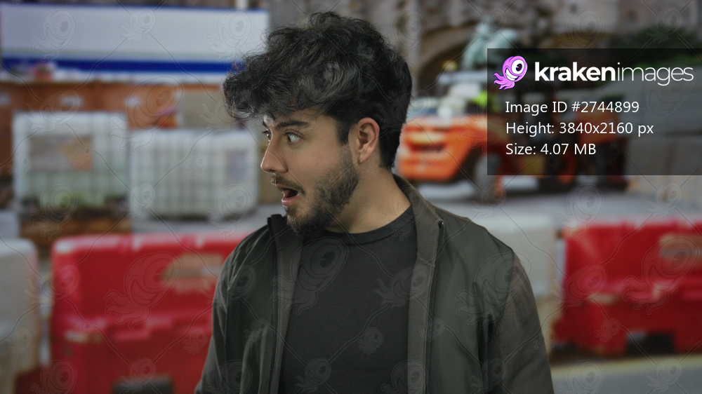 Young hispanic man with beard showing surprise at an outdoor construction site with machinery in the background, highlighting industrial and work elements. - Kraken Images