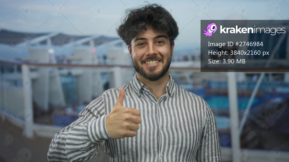 Young hispanic man with beard smiling on cruise ship deck outdoors