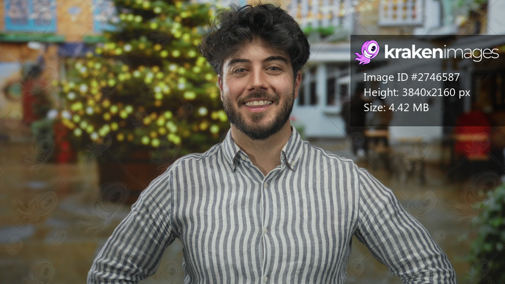 Young hispanic man with beard smiling outdoors on a street with festive lights and a christmas tree, wearing a striped shirt and casual attire, enjoying the holiday atmosphere. - Kraken Images