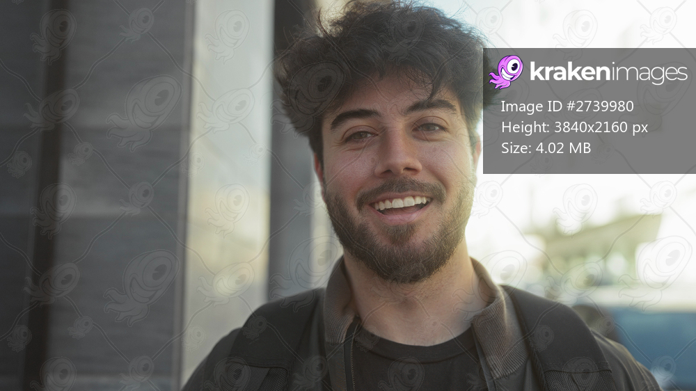 Young hispanic man with beard smiling outdoors on a sunny day, wearing a casual jacket and backpack, standing near a building with soft focus background. - Kraken Images