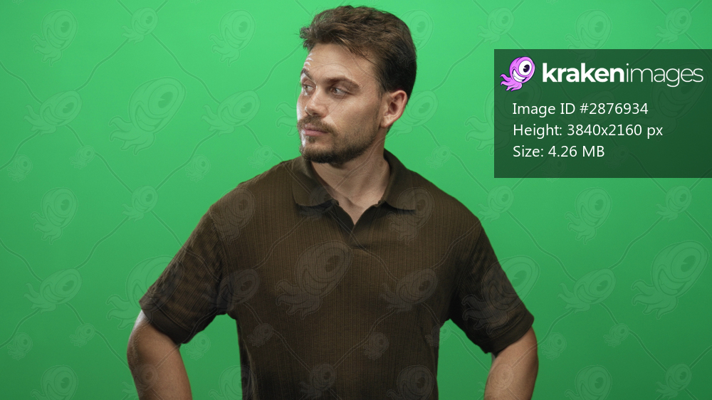 Young hispanic man with beard wearing brown polo, hands on hips and looking to the side in studio against green backdrop; quiet contemplation.