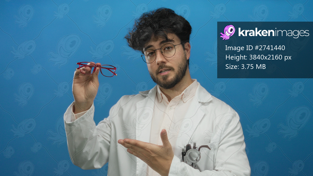 Young hispanic man with beard wearing glasses holds red spectacles in hand against blue background, dressed in white lab coat with a stethoscope, showcasing a thoughtful expression. - Kraken Images