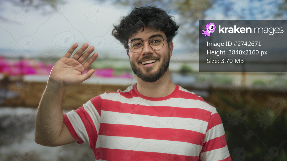 Young hispanic man with beard wearing glasses in red striped shirt smiling and waving outdoors on a sunny day with a blurred garden background