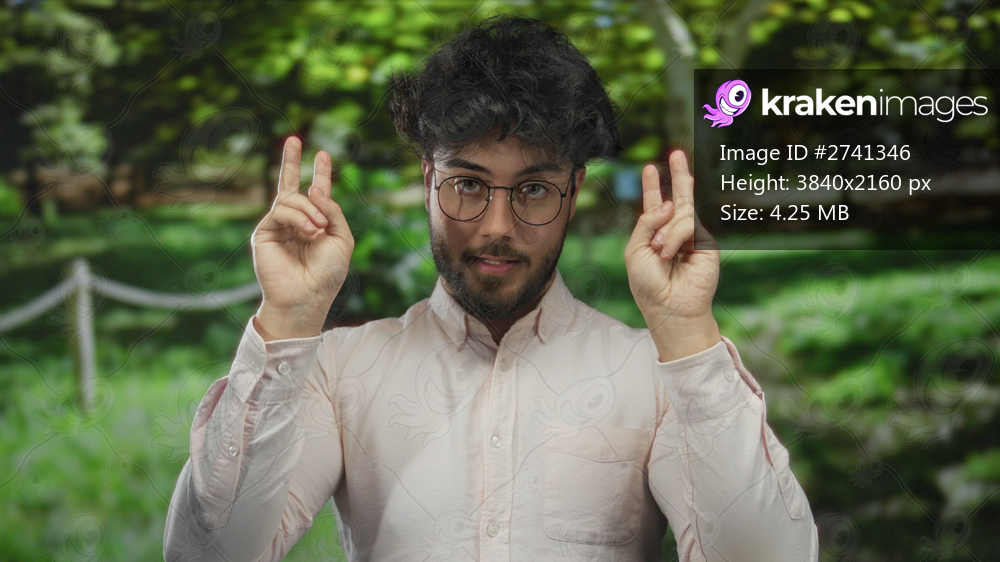 Young hispanic man with beard wearing glasses and white shirt making air quotes in a sunny green park setting.
