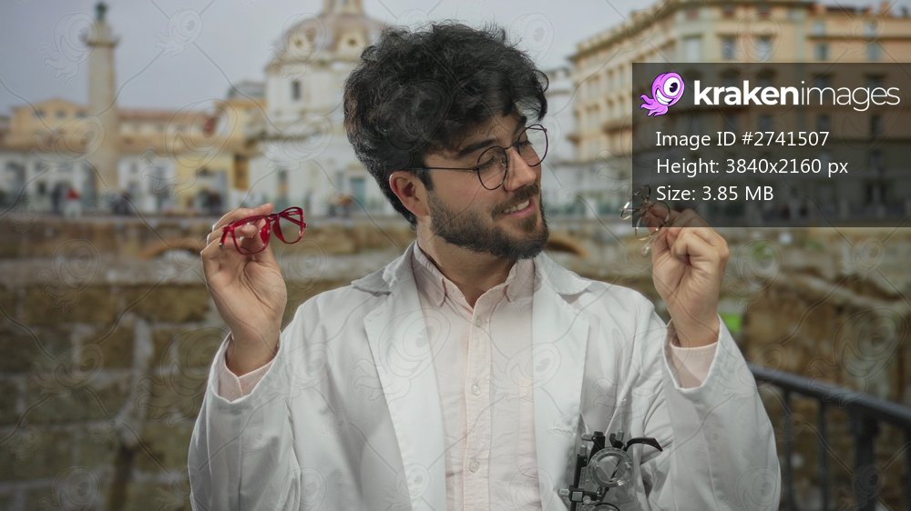 Young hispanic man with beard wearing white coat, holding two pairs of glasses in sunny roman ruins.