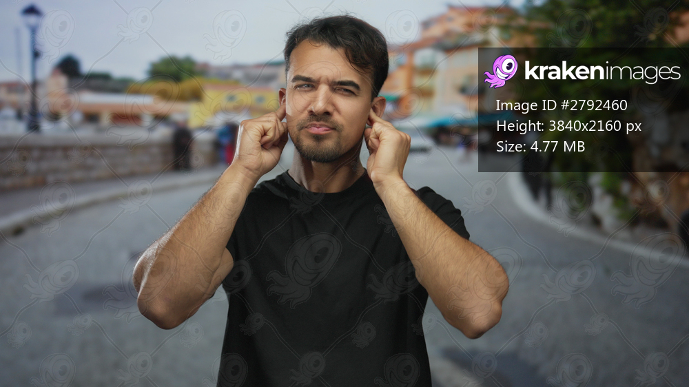Young hispanic man blocking ears on city street featuring urban outdoor scene with vibrant buildings and blurred background highlighting dynamic atmosphere and diverse cultural setting. - Kraken Images