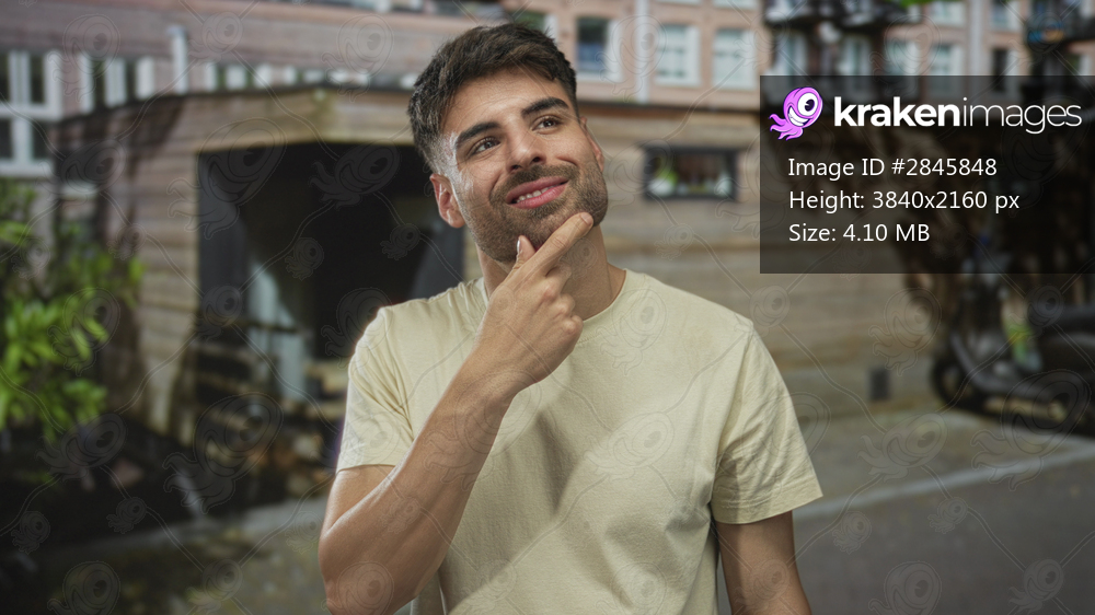 Young hispanic man with brown beard touches chin with finger on urban street; thoughtful reflection.