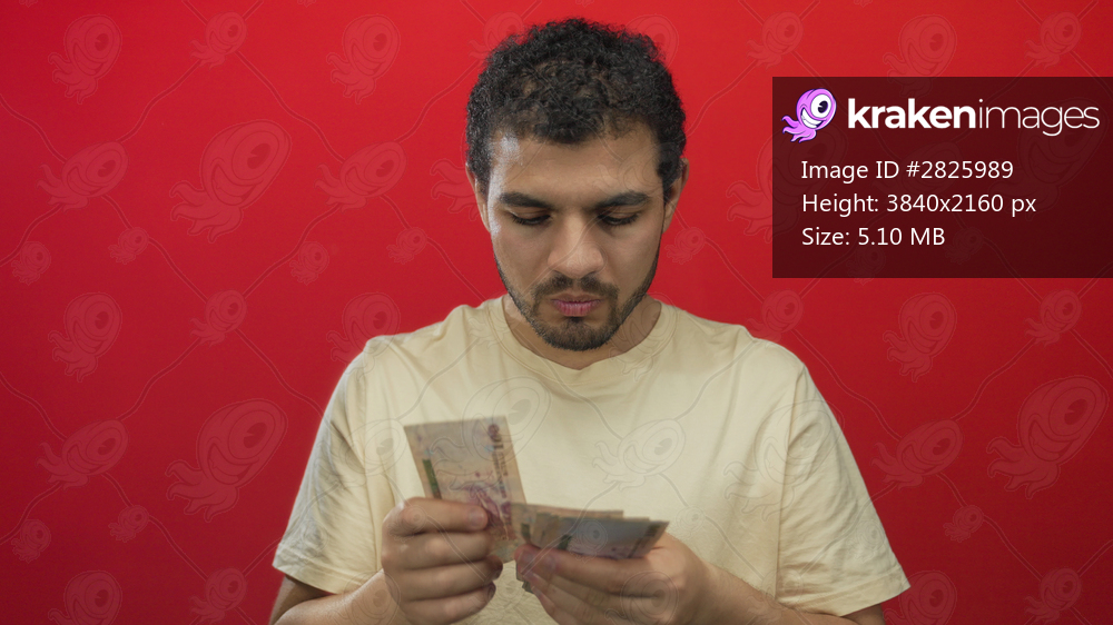 Young hispanic man carefully counting saudi riyal banknotes with bare hands in red studio; financial planning focus.