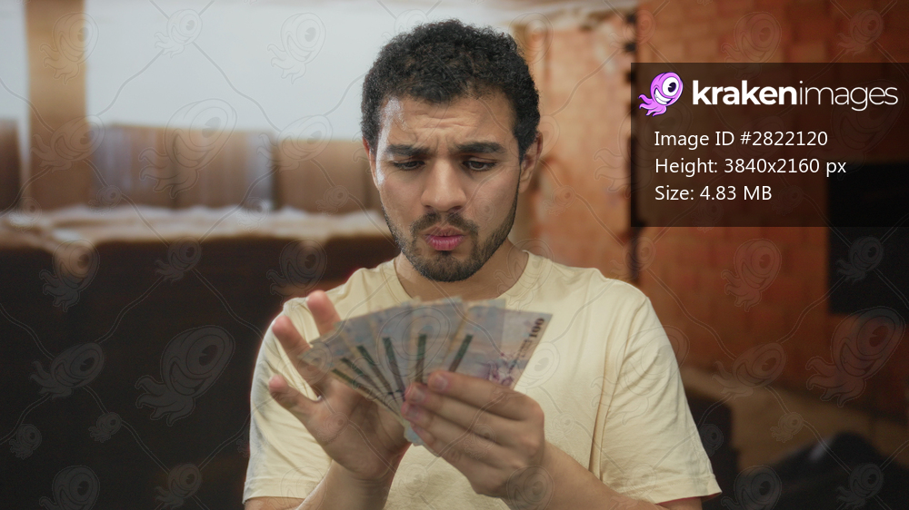 Young hispanic man carefully counts riyal banknotes inside building with exposed brick walls; uncertainty.