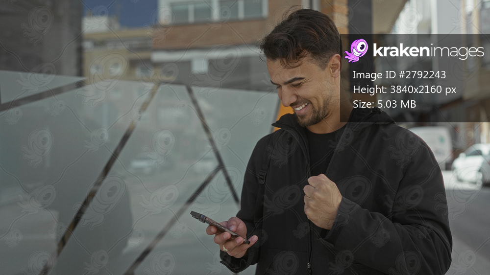 Young hispanic man checking smartphone on a sunny city street shows excitement and energy outdoors.