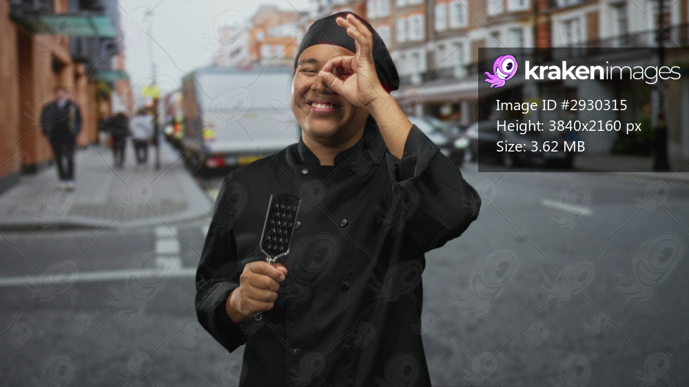 Young hispanic man chef holding a grater and making ok sign to eye on a city street; pride celebration.