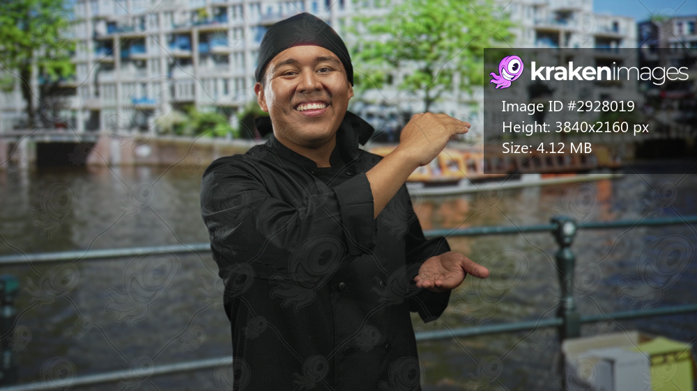 Young hispanic man chef in black uniform and headscarf holds hands apart measuring gesture on canal street in amsterdam, smiling with closed eyes; pride craft skill. - Kraken Images