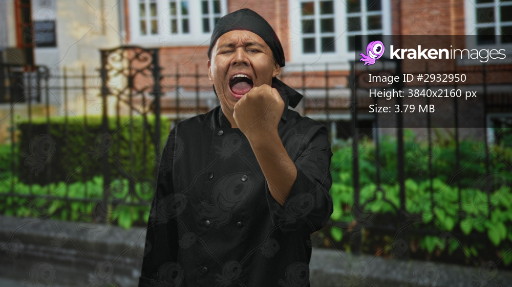 Young hispanic man chef in black uniform shouting with clenched fist, standing at building entrance outdoors with iron gate behind him; determination grit. - Kraken Images
