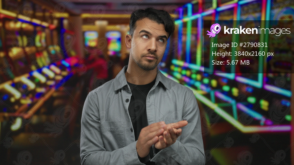 Young hispanic man clapping hands at a vibrant casino with colorful slot machines creating a lively indoor atmosphere