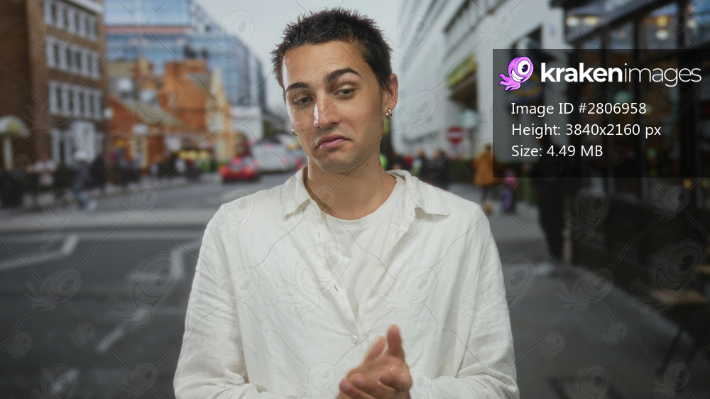 Young hispanic man claps hands on urban street in front of storefront with casual gaze and calm posture; indifference.