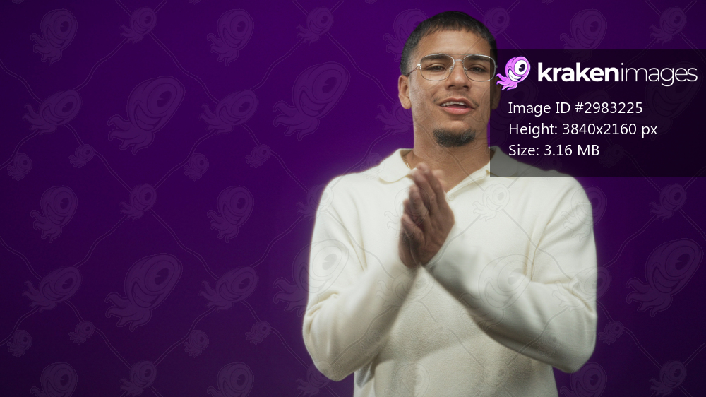 Young hispanic man claps hands and smiles, wearing white sweater and glasses in a purple studio; celebration joy.