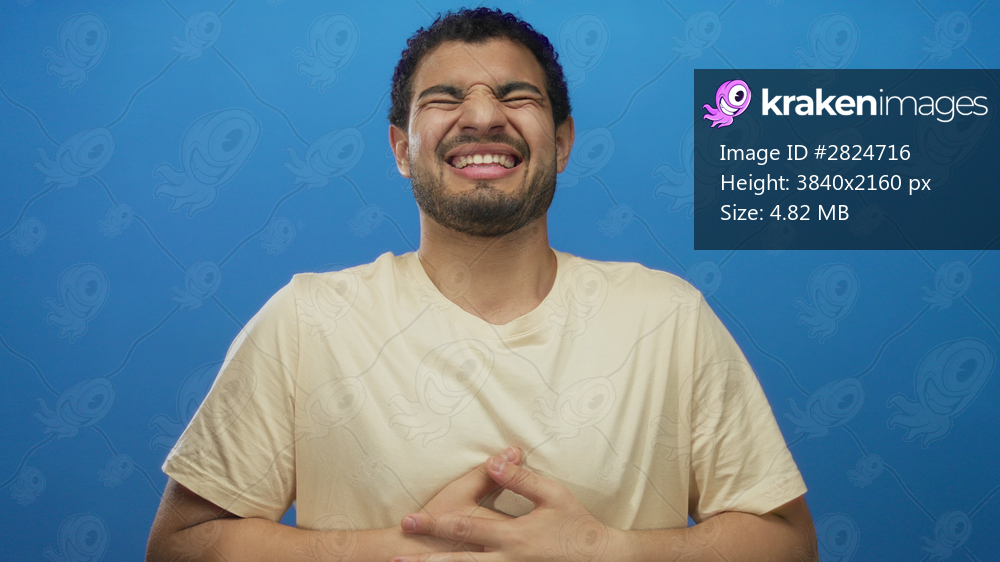 Young hispanic man clasp hands over stomach in studio setting while casually smiling with eyes closed; joy.