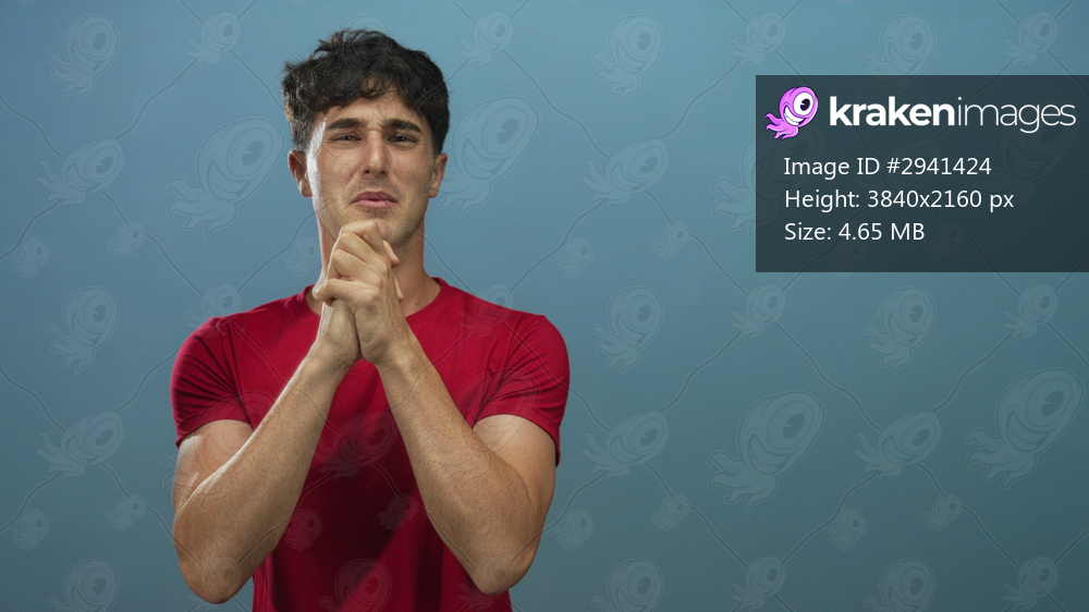 Young hispanic man with clasped hands and pleading facial expression in blue studio; pleading sincere hope.