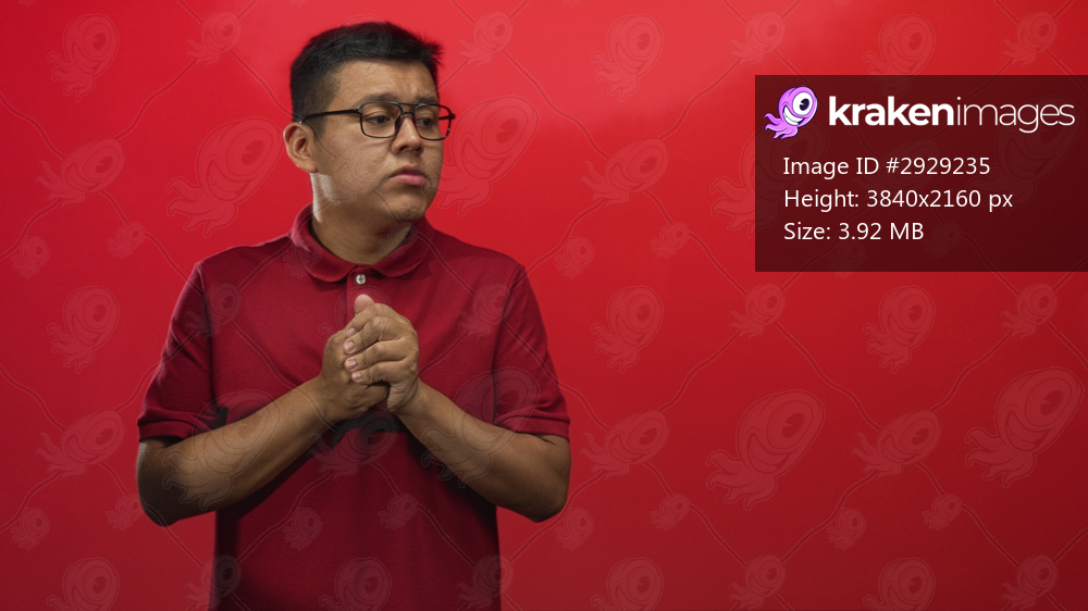 Young hispanic man clasping hands and fidgeting in studio against a red wall; nervousness hesitation doubt.