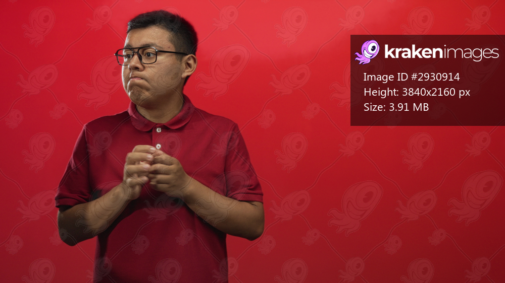 Young hispanic man clasping hands and fidgeting in studio against a red wall; nervousness hesitation doubt.