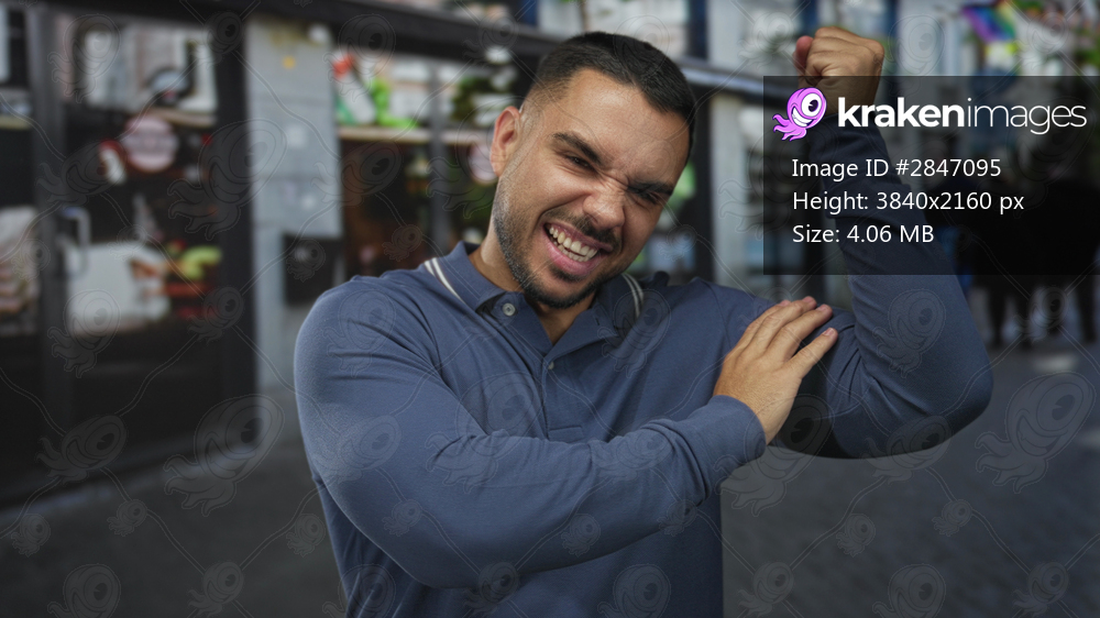 Young hispanic man clenches fist and grips upper arm on busy cobblestone street lined with storefront windows; pain.