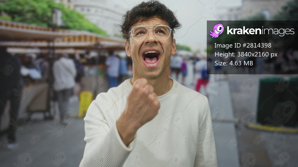 Young hispanic man clenches fist on street near market stall with tense expression; anger frustration.