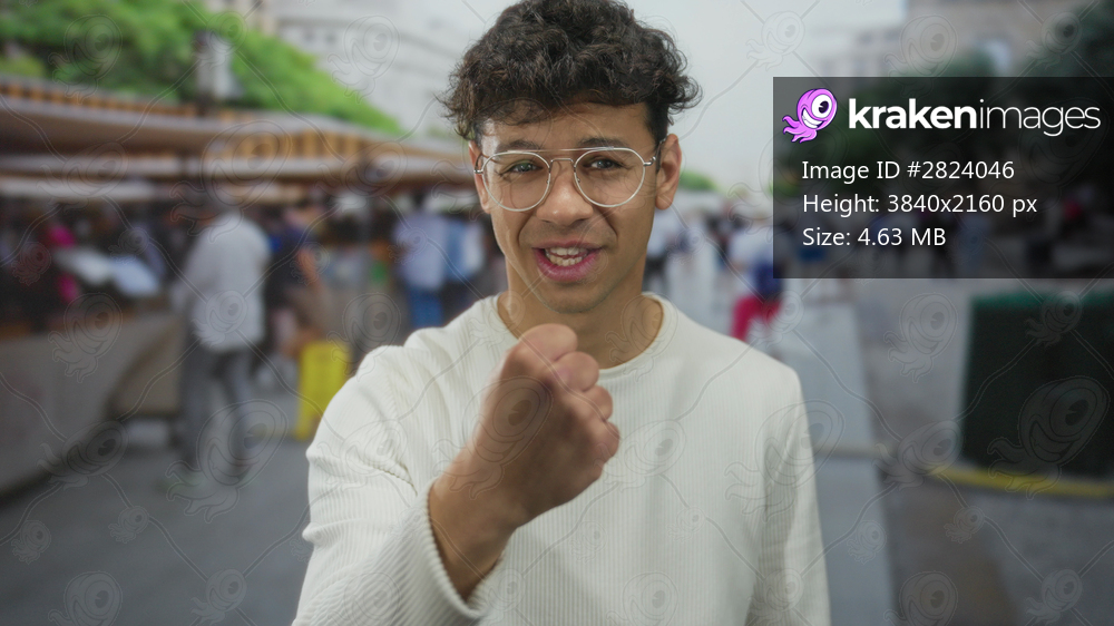 Young hispanic man clenches fist on street near market stall with tense expression; anger frustration.