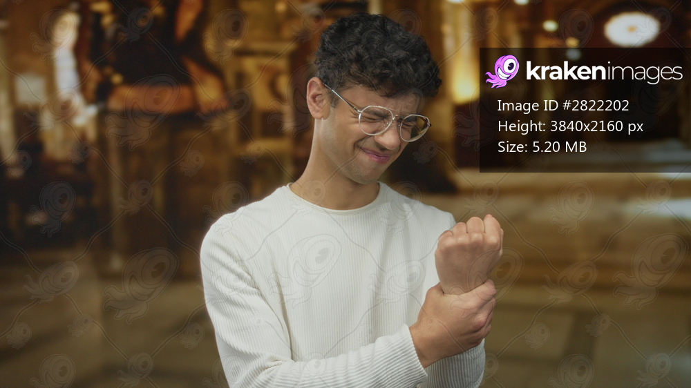 Young hispanic man clutching bare wrist under vaulted arches and flickering candles inside church; distress.