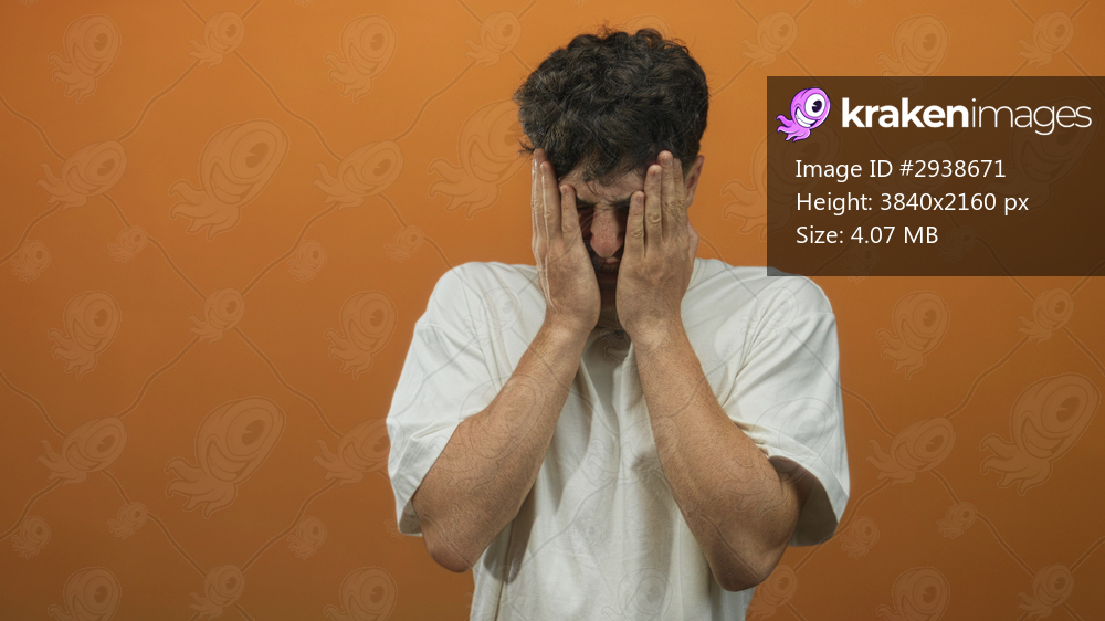 Young hispanic man clutching chest with hand, turning head in studio against orange backdrop while wearing a white t shirt; anxiety.