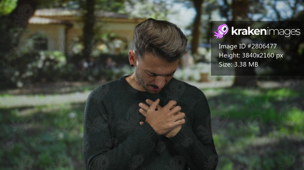 Young hispanic man clutching chest in lush sunlit park clearing during daytime, wearing green sweater; pain.