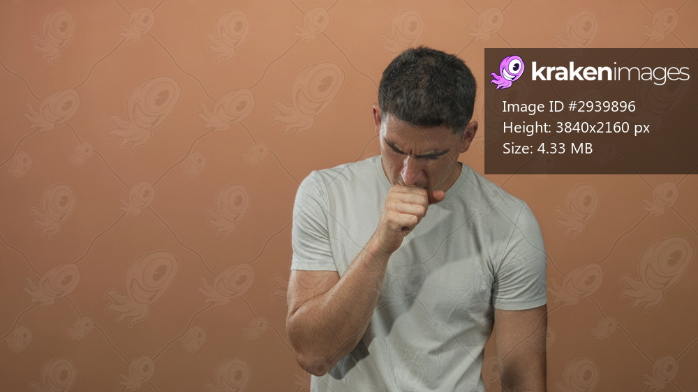Young hispanic man coughing into fist in studio against peach backdrop; sickness vulnerability concern.