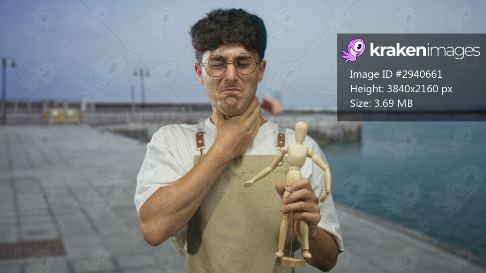 Young hispanic man coughs into fist while holding a wooden artist mannequin on a street promenade by the seaside pier; vulnerability.