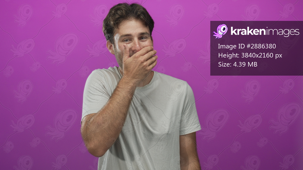 Young hispanic man covering mouth with hand in magenta studio session wearing light gray t shirt; embarrassment reaction.